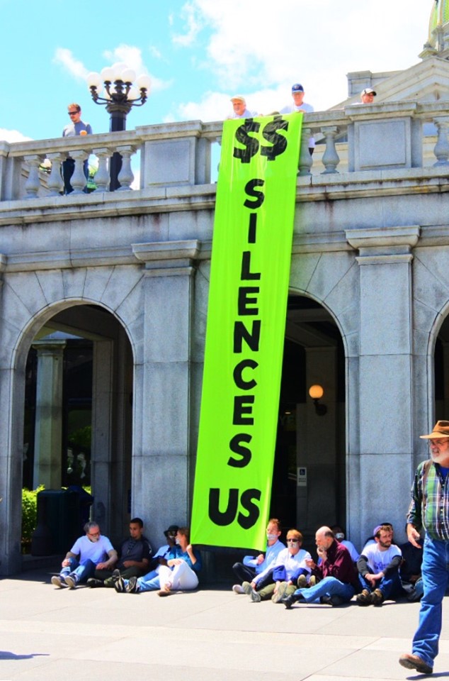 In total, 20 activists were arrested at the State Capitol for protesting. MarchOnHarrisburg Executive Director, Rabbi Michael Pollack was arrested with 11 others for blocking the East Wing entrance into the Capitol, with dollar bills marked “Bribe” taped over their mouths. Activists from above the sit-in dropped a banner which read, “$$ Silences Us.”