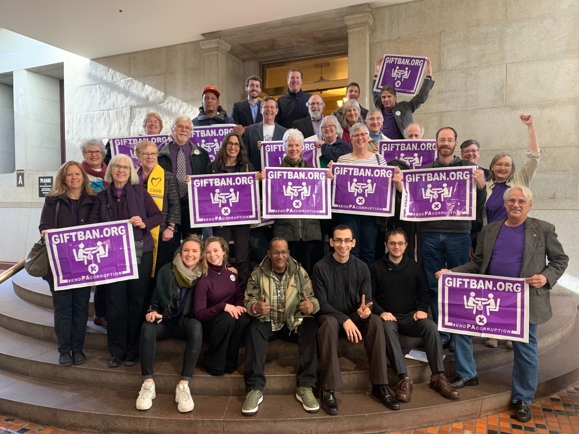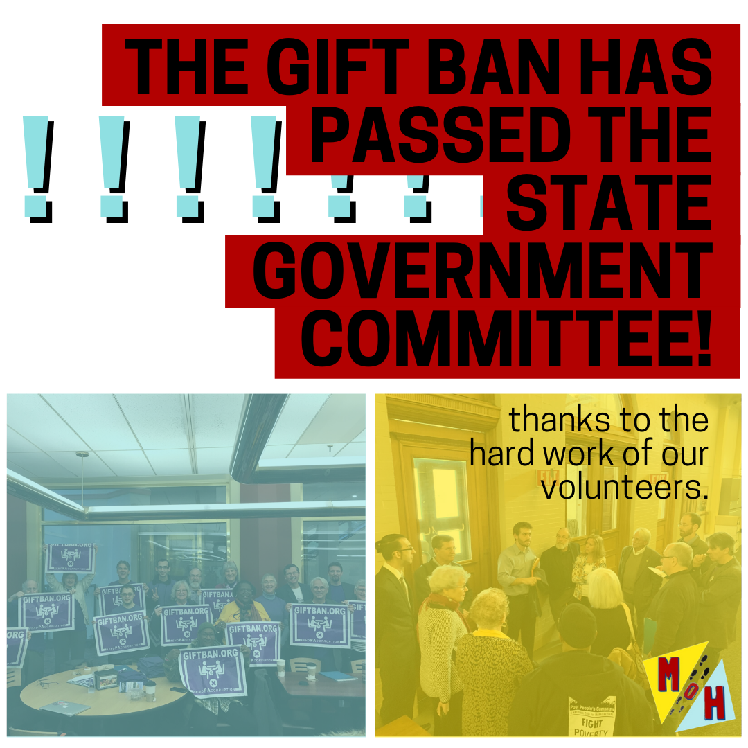 On November 19, 2019, just two and a half years after we started our campaign, HB1945 passed out of the State Government Committee because of our advocacy! Our volunteers packed the hearing and showed the Committee that Pennsylvanians want a Gift Ban.