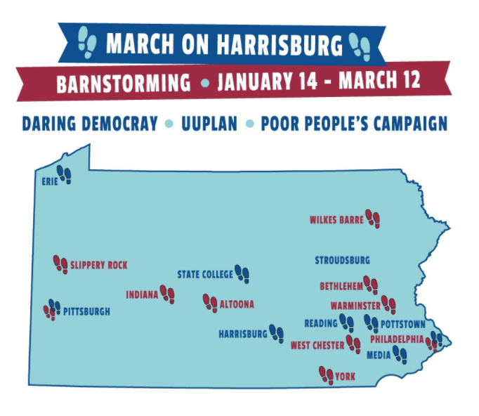 In the winter and spring of 2018, we barnstormed across Pennsylvania, holding events in 20 cities from Erie to Philadelphia and building support for the Gift Ban while growing the statewide infrastructure necessary to win the democracy that we need. We developed leaders and seven chapters across the Commonwealth. In May 2018, as part of the Poor People’s Campaign: A National Call for Moral Revival, we engaged in six weeks of nonviolent direct action at the State Capitol and established the Gift Ban campaign as an interconnected part of the much larger moral fusion movement toward justice.