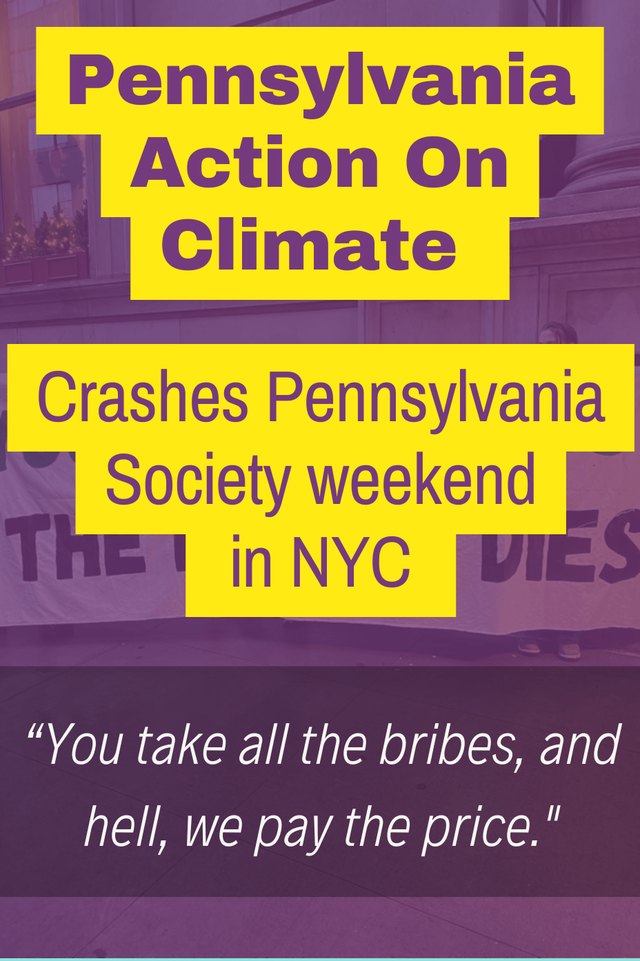 “We are here because this place, this event, is an orgy of corruption.” — Michael Bagdes-Canning-Canning, PAC Member by Beth Taylor, MarchOnHarrisburg, and Michael Bagdes-Canning, Pennsylvania Action On Climate On December 3rd, Pennsylvania Action on Climate (PAC), a coalition of climate and anti-corruption activists, crashed the Pennsylvania Manufacturers Association luncheon at the Pennsylvania Society WeekendContinue reading ““You take all the bribes and we pay the price,” – Pennsylvania action on climate Crashes the 24th Annual Pennsylvania Society Event in New York City”